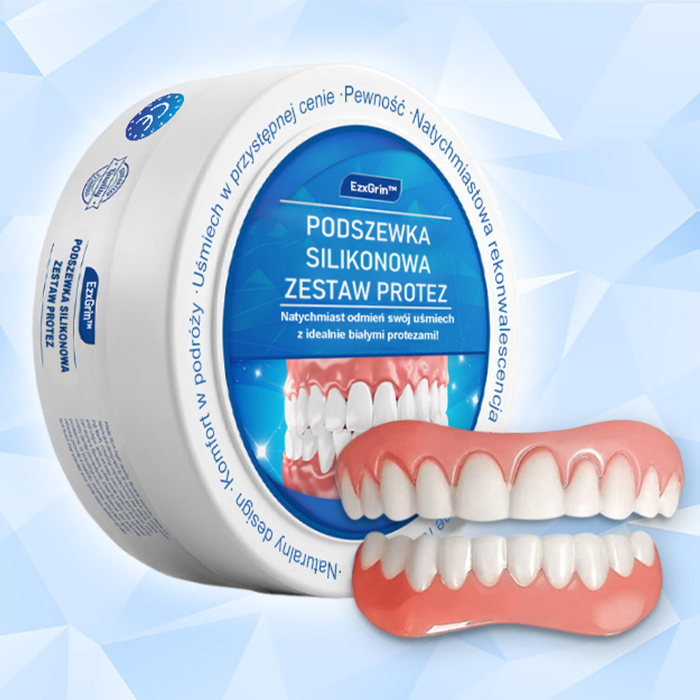 Zestaw zawiera:Zestaw silikonowych podkładek do protez EzxGrin™ x 1 zestaw (górne i dolne zęby)