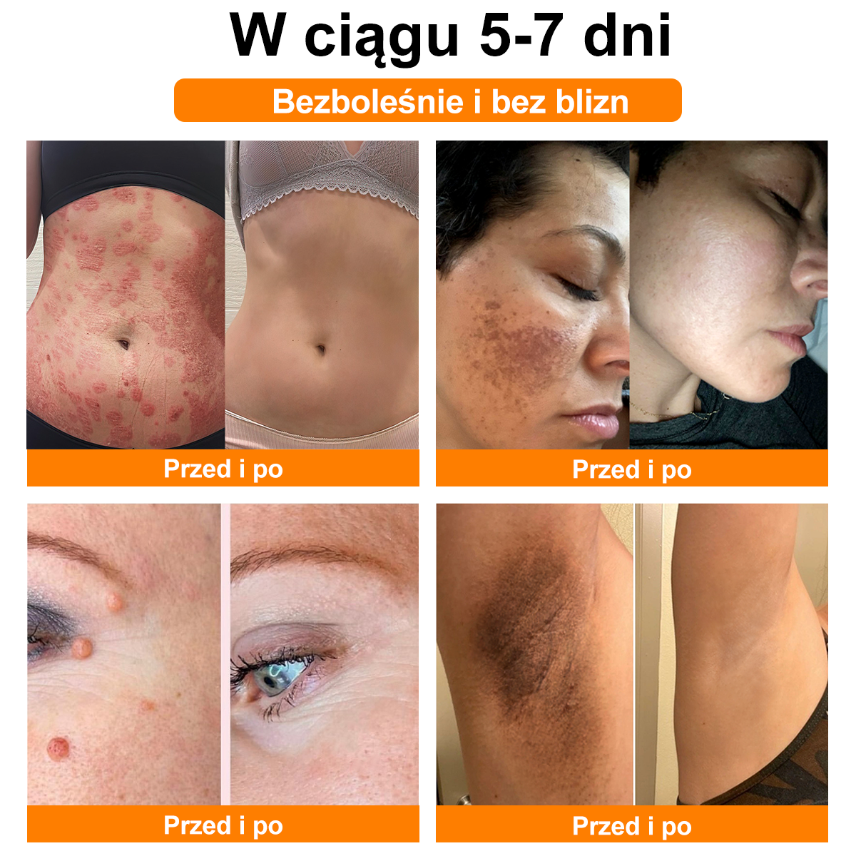 - Usuwa znamiona skórne, brodawki i pieprzyki