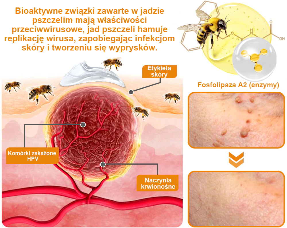 Jad pszczeli: Jad pszczeli pochodzi z jadu pszczół nowozelandzkich, który jest pozyskiwany poprzez stymulację eterowym znieczuleniem. Ten naturalny materiał nie zagraża życiu i znany jest z potencjalnych korzyści w leczeniu różnych brodawek i problemów skórnych. Może regulować odpowiedź immunologiczną i hamować cytokiny sprzyjające stanom zapalnym, łagodząc w ten sposób objawy łuszczycy. Ponadto jad pszczeli ma stosunkowo bezpieczne właściwości immunomodulujące i przeciwwirusowe. Dzięki temu skutecznie leczy wirusowe brodawki i potrafi efektywnie zniszczyć komórki skóry wewnątrz brodawki, które stopniowo rozluźniają się i odpadają w ciągu 1-2 tygodni. Odkryte przez nas peptydy jadu pszczół mają silne właściwości przeciwzapalne, które pomagają zmniejszyć stan zapalny związany z brodawkami.