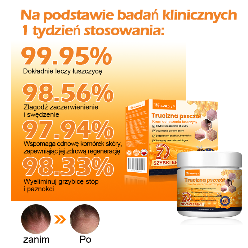 Połączyłem różne składniki roślinne, które od dawna udowodniły swoją skuteczność w leczeniu chorób skóry, i opracowałem SiłaSkóry™ Trucizna pszczół Krem do leczenia łuszczycy. Dowody z badań wskazują, że ten krem jest najlepszym wyborem w terapii chorób skóry, zwłaszcza w leczeniu łuszczycy, narośli skórnych i keratozy seborreicznej, gdzie wykazuje znaczną poprawę.